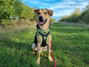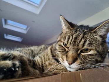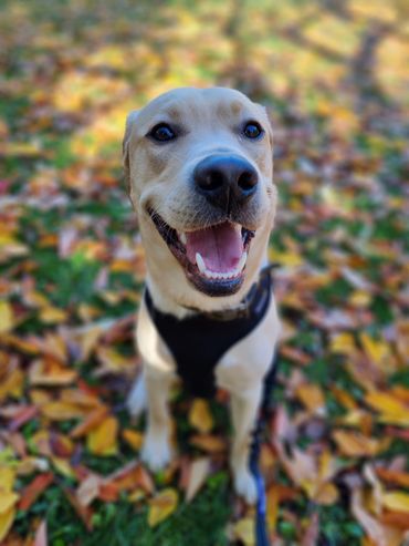 Weimaraner  looking at the camera with a smiling face during a dog sitting visit